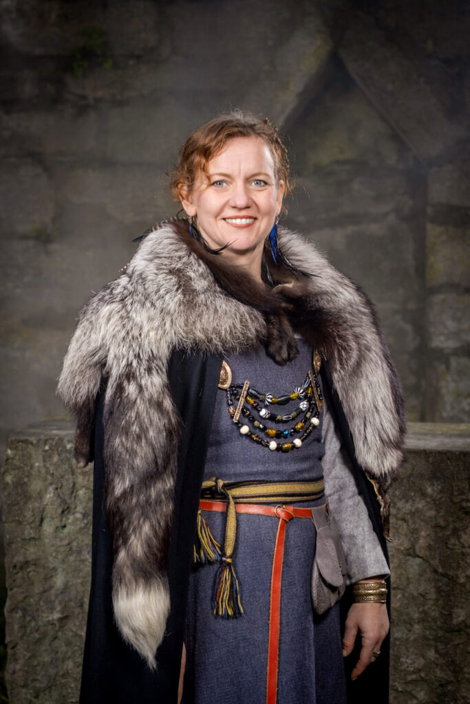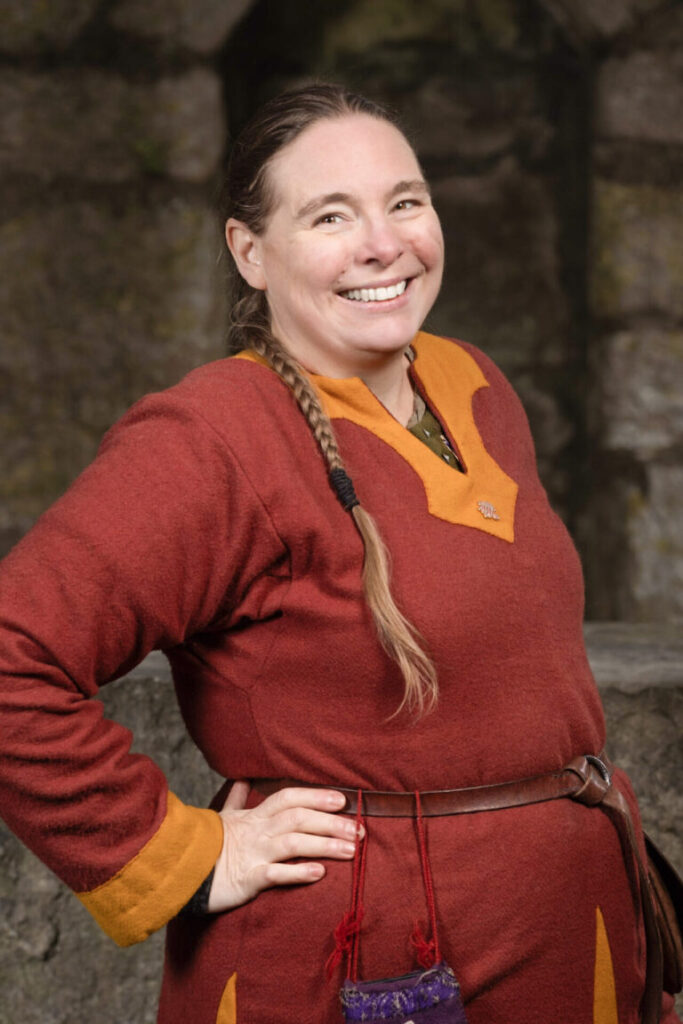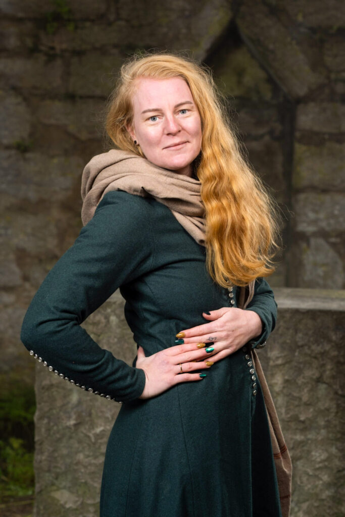 Gotland und Västergarn ist mein zweites zuhause. Dort habe ich all meine traumhaften Sommer verbracht. Ich habe im Fluss geangelt, ich bin an späten Abenden ohne Sattel ausgeritten, ich hatte Sand im Haar, ich habe Lammbraten von dem Grill gegessen und Nachbarschaftspartys beigewohnt. Mein Mittelalter begann schon in frühster Kindheit. Meine ersten Erinnerungen sind Picknicks in „Almedalen“ mit meinen Verwandten, lebhafte Märkte auf „Strandgatan“ und ein Furchteinflößender Valdemar Atterdag der sich dafür Geld geben lies das er die Stadt nicht niederbrennt. Als ich 13 Jahre alt war bekam ich die braunen Samtgardienen meiner Mutter, und nutzte diese um mir mein erstes eigenes Kleid zu nähen. Heute habe ich als neuer Zuschuss (2023) des Büros die Möglichkeit mit meiner Kompetenz beizutragen. Ich bin bewandert in der Projektleitung, und in der Organisation von Künstler/innen und Veranstaltungen. Mein Anliegen ist es gute Kommunikation und Zusammenarbeit zwischen dem Büro und den Mitwirkenden der Mittelalterwoche zu erschaffen, sodass jeder ein magisches Mittelalter in der 32 Kalenderwoche erleben kann.